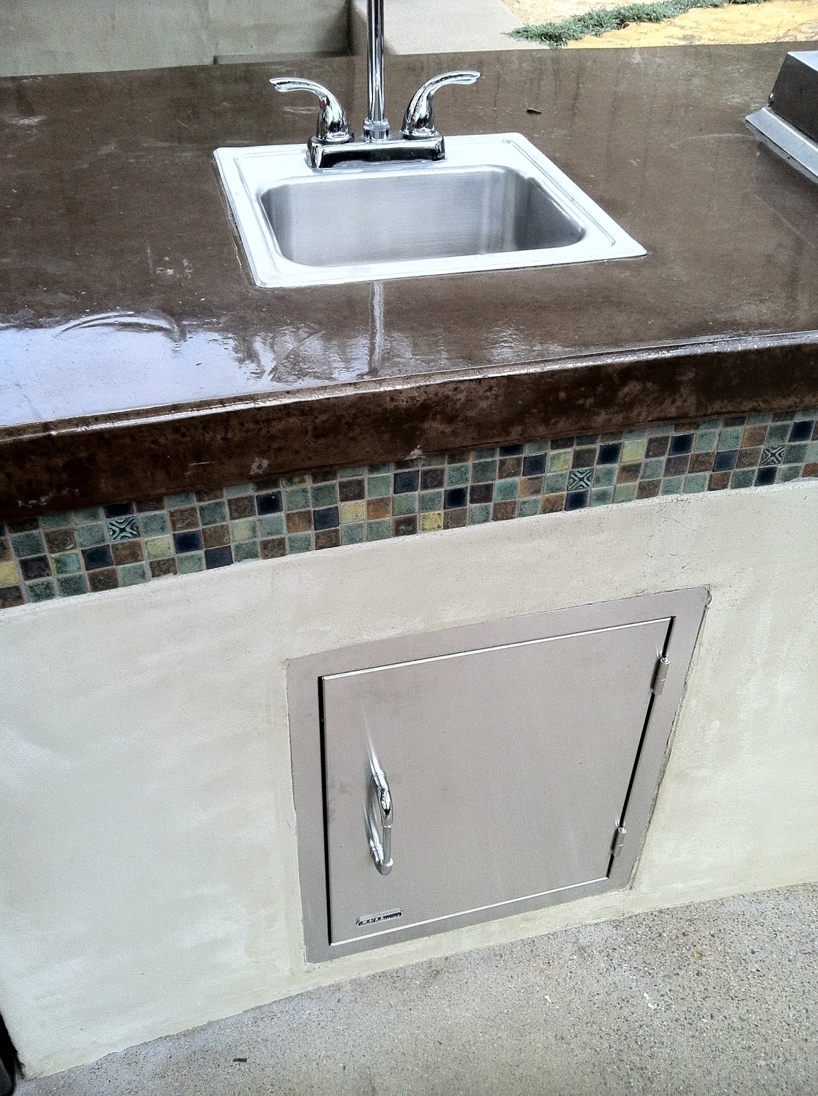 I also just adore the materials: a poured-in-place concrete counter, stained a dark chocolate brown and sealed with an epoxy sealer for that hard-as-glass look, Syzygy tile mosaics just under the counter, and a clean smooth stucco on the sides. The paving that you can see just a little is a colored concrete that has a top cast finish to give it that sandy look.