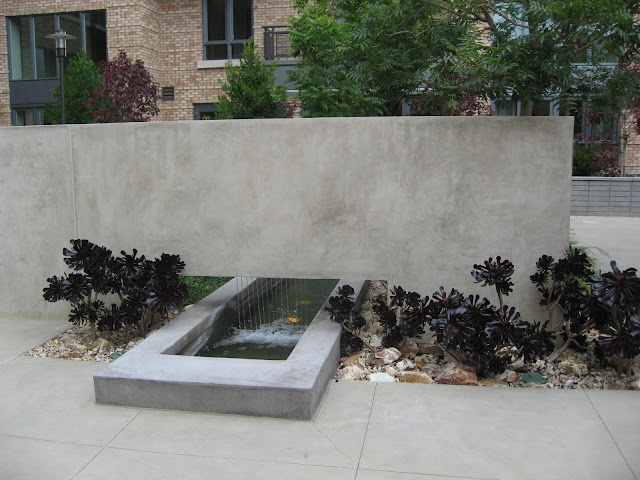 Just in case my love of clean lines isn’t entirely obvious at this point, I just have to say that I love this fountain feature! I love the intersection of planes from the tall wall, ground plane, and basin. I like that the moving water, the fountain part of the fountain, is dwarfed by the wall, but the sound still dances around the courtyard. I like the mix of rock sizes in the planters from small gravels to medium sized river cobble. I like the restraint of a single species of plant material (Aeonium ‘Zwartzkoff’ and please don’t quote me on the spelling of that).